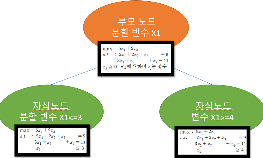여기서 분지를 잘봅시다. 저기서 원문제에 관해 제약식을 추가하여 두 개의 새로운 문제를 등록하는 과정은 0-1계획법 분지계획법 풀이에서 보았던 트리가 생성되는 과정입니다.