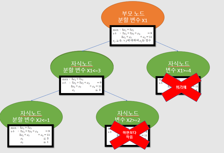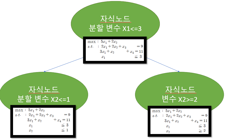 그 다음 저 제약식을 포함한 두개의 자식 노드로 나뉜거죠